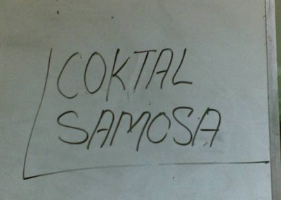 This was in the office canteen, where each day’s menu is written out. This was the menu for an evening snack. All i could understand was the ‘Samosa’ part ! ‘Coktal‘ i didnt get. I thought of ‘Cocktail’, but this was the office & things don’t add up. Nevertheless, if you do know, please do write in with the recipe of a cocktail somasa pls.