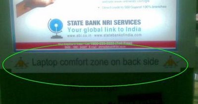 This was at the Ahmedabad airport. I couldn’t figure this for sometime. ‘Laptop comfort zone on backside’ !! After battling it for sometime, i walked to the rear of this hoarding, and found plug points for recharging your laptop. Ok. So that’s Laptop comfort zone. On the backside !