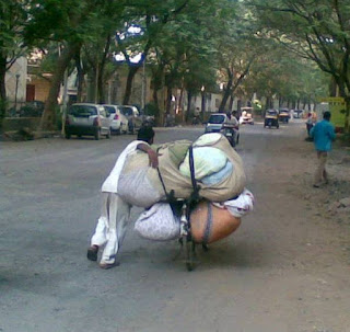 Ask the laundry guy. The clothes of an entire neighbourhood (which can get as big as a small country), gets rolled into bigger bed sheets, and carefully bundled on to become big lumps that helped balance. Taken for a wash and a press. An entire industry survives. A neighbourhood walks fresh and sprightly!