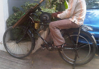 News when nestled within the columns of a newspaper take a different shape and hue when something similar is spotted in real life. For instance, a bicycle that can transport and help sharpen knives when stationary. A contraption that comes alive by pedaling a stationary bicycle thereby getting a different stone wheel to rotate! Which sharpens knives!