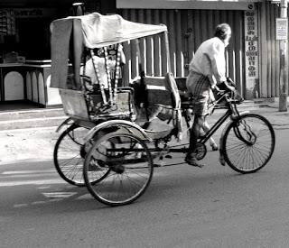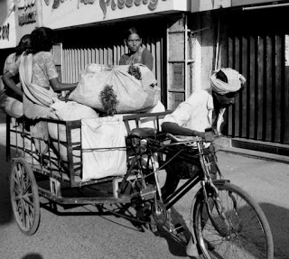 The rickshaw and the tricycle continue to be lynchpins in transporting people in many parts of rural India. The power of bulging human calfs, heaving biceps and ballooning invisible lungs doing the work that infinitely more powerful inanimate engines do around the world.