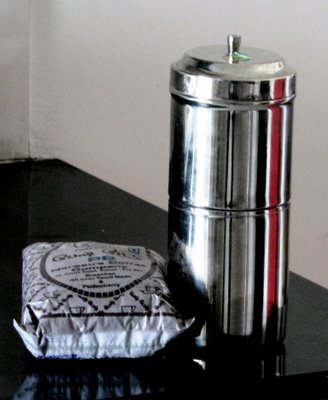 During this trip back home, coffee powder was picked up. ” ‘PB’ standing for ‘Peaberry’ ” we were told. The coffee filter was picked up, right here in Mumbai. And voila there is a