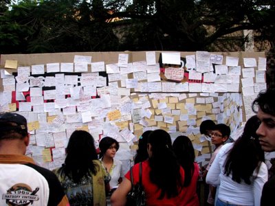 Messages intended for Pakistan. For who in Pakistan, is not known. But headed in that geographic direction. Hand written scrawls to meticulously crafted chits, they are all there. They catch the breeze and flutter. The chits seem to battle for freedom. The glue continues to beat the breeze by holding on to the chits.