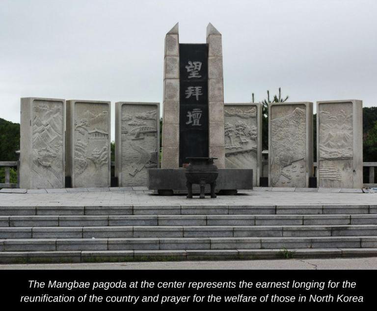 Five million people left their home in the north, where they had lived for generations, to avoid the Soviet army and the North Korea Communist Party’s persecution and brutalities. The refugees built a temporary altar at Imjingak on every Chuserok (Korean Thanksgiving day ), held an event to honor their ancestor and parents who had been left behind in North Korea, and longed for a permanent altar. In terms of scale and form, the censer and altar are located on a 400-m site. The Mangbae pagoda at the center represents the earnest longing for the reunification of the country and prayer for the welfare of those in North Korea. The characteristics of the historical remains, institutions and customs and mountains and streams of the 5 North Korean Provinces, and the non-reclaimed area, Gyeonggi and Gangwon were carved in seven granite stone-folding screens around the pagoda to ease the homesickness of the refugees.”