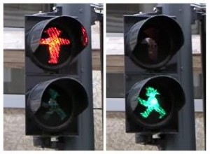 A traffic light in Berlin. Whats so special, you may wonder. Indeed there is. Well, for one they are not uniform. Thats surprising for Germany, wont you think?
