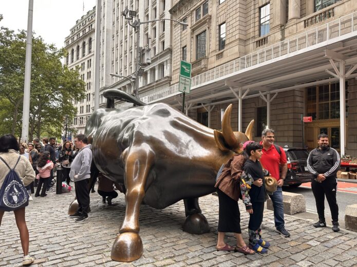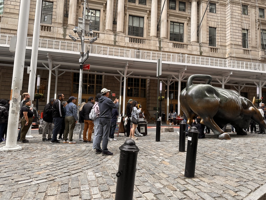 Near Wall Street, there are two queues around a bronze bull. Yes. The Charging Bull of Wall Street.