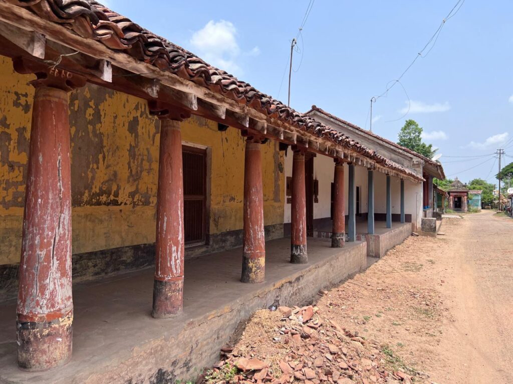 We passed through a deserted Agraharam to get there. Long colonnaded houses, ochre walls peeling in slow strips, red pillars standing at attention for a life that had quietly packed up and left. Somewhere in those corridors, families had cooked and argued and celebrated for generations. Now, just footsteps and a silence that wasn’t empty. The kind that remembers.